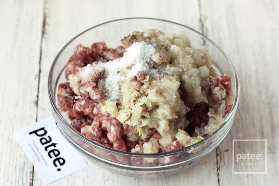 Фарш посолить, добавить лук, пропущенный через мясорубку, и специи.