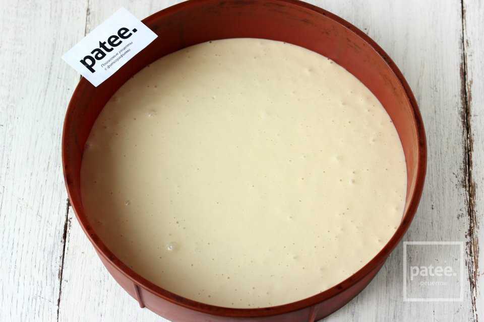 В форму для выпечки пирога переливаем сметанное тесто, разравниваем поверхность. Я использовала силиконовую форму диаметром 24 см. Если у вас форма не силиконовая, то смажьте дно и бока небольшим количеством масла.