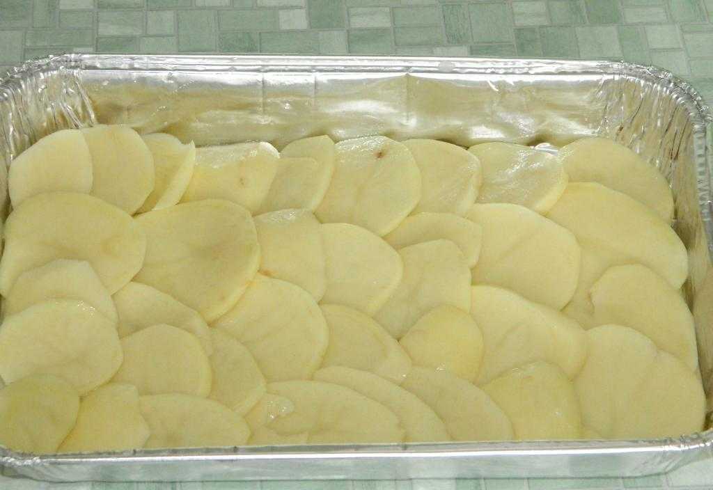 Лук очистить и нарезать полукольцами. Разложить лук по картофелю.