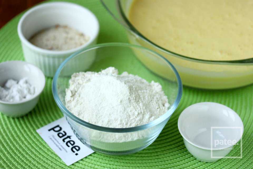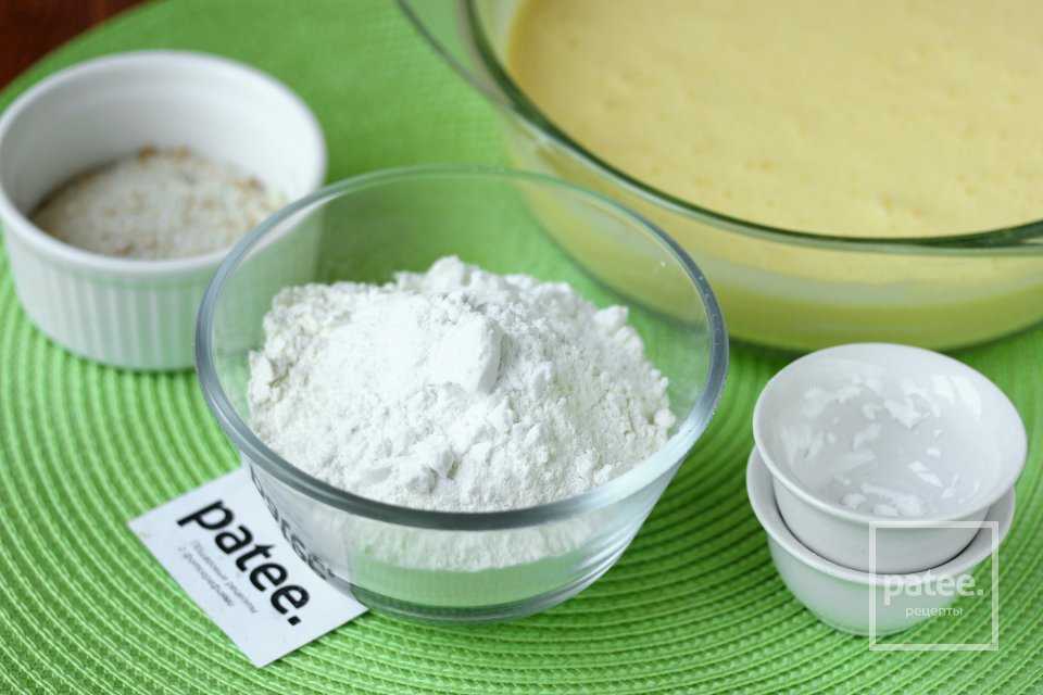 Просеиваем смесь сухих ингредиентов в яично-сметанно-майонезную смесь. Замешиваем однородное жидкое тесто.