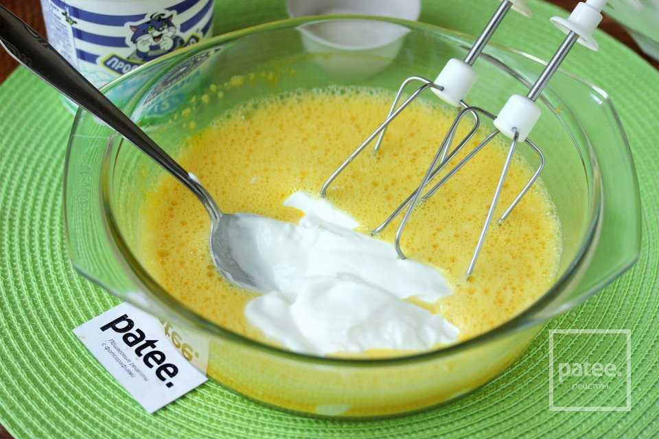 Взбиваем яйца в течении трёх минут миксером, затем добавляем в получившуюся яичную смесь сметану.