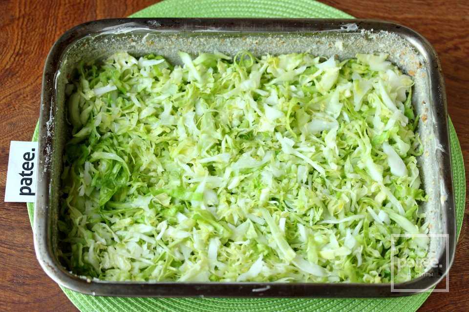 В подготовленную форму выкладываем нашинкованную молодую капусту, разравниваем поверхность.