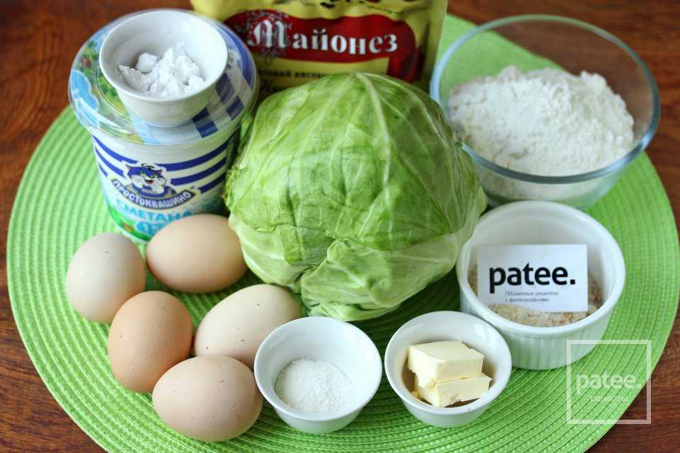 Для приготовления заливного пирога с молодой капустой нам понадобятся следующие ингредиенты: куриные яйца, молодая белокочанная капуста, сметана, майонез, картофельный крахмал, пшеничная мука, панировочные сухари, сливочное масло, разрыхлитель, вода, соль.