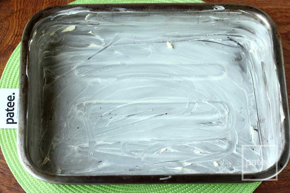 Форму для выпечки щедро смазываем сливочным маслом. Я использовала прямоугольную форму размером 30 на 22 см.