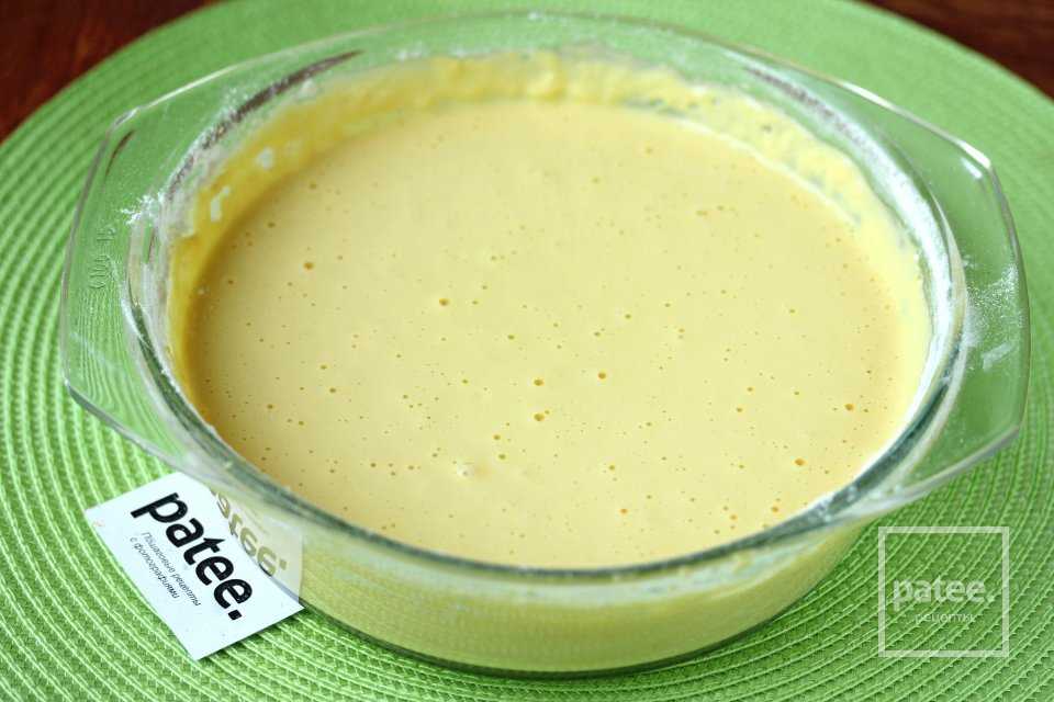 - Противень с глубокими бортиками или форму для выпечки смажьте растительным маслом, залейте половину теста.