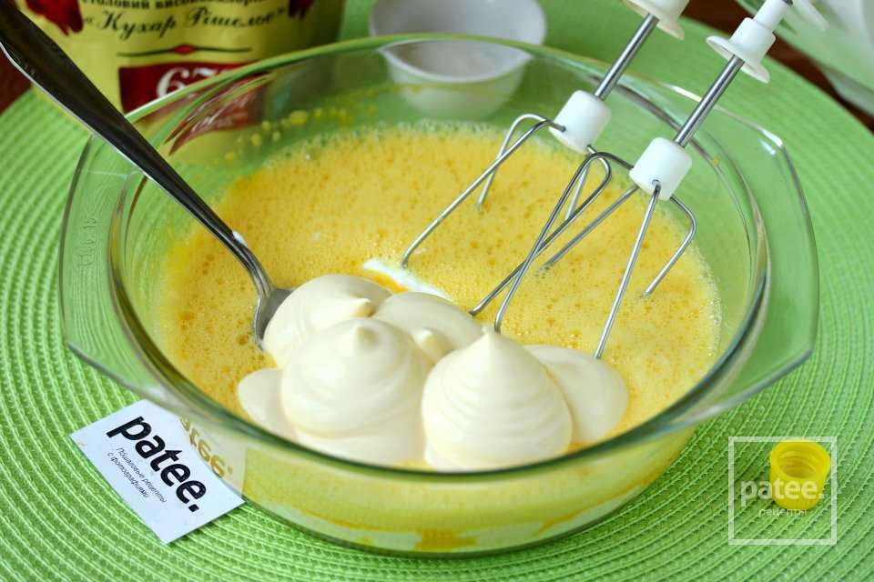 Вслед за сметаной в яичную смесь добавляем майонез.