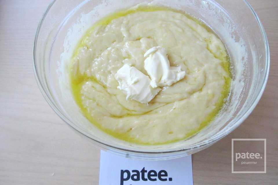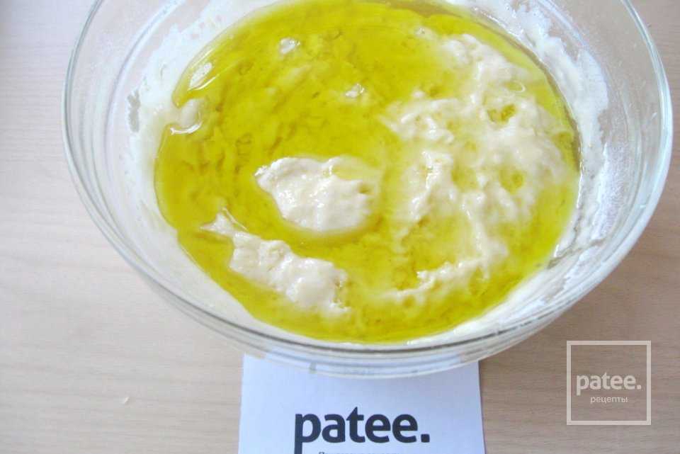 Перемешиваем тесто с оливковым и сливочным маслом. Можно взбить миксером.