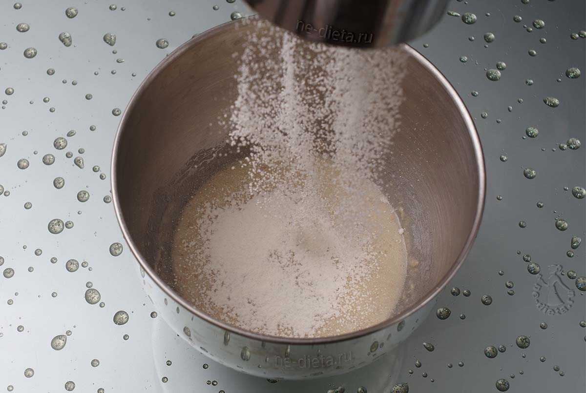 В миску с просеянной мукой добавить отруби и просеять к ним разрыхлитель.