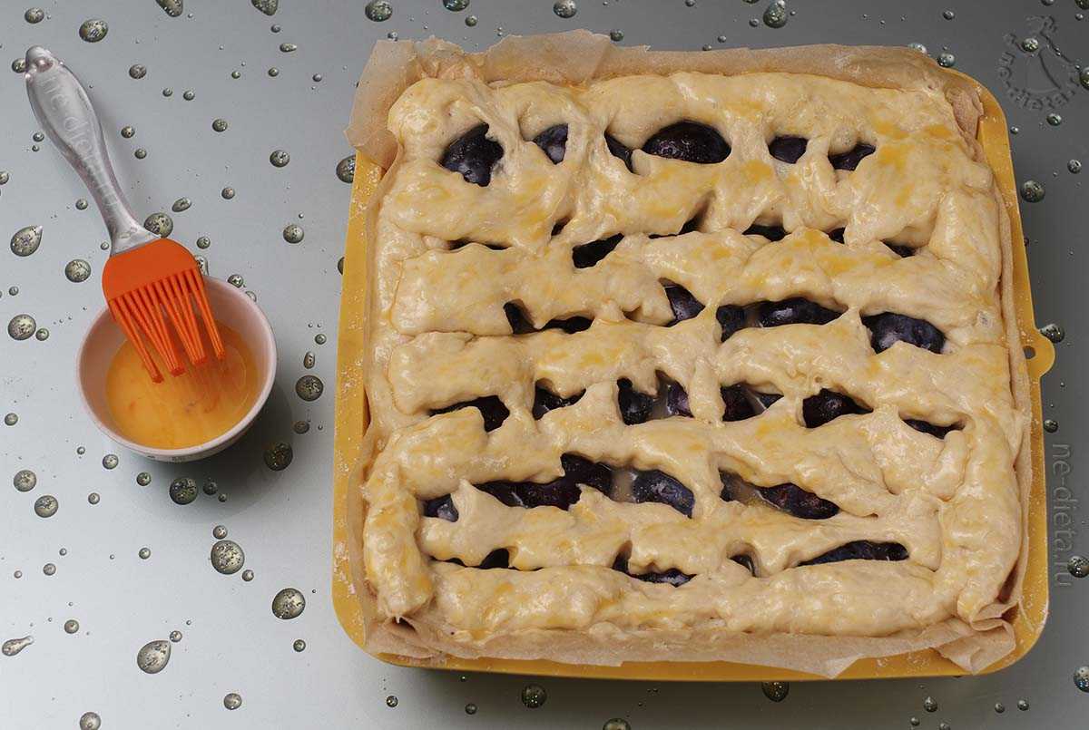 11. Оставшееся тесто раскатать, нарезать на полоски и накрыть ими сверху сливовую начинку. Соседние полоски теста можно местами соединить друг с другом, чтобы получилось что-то наподобие сетки. Смазать полоски теста сверху отложенным яичным желтком.