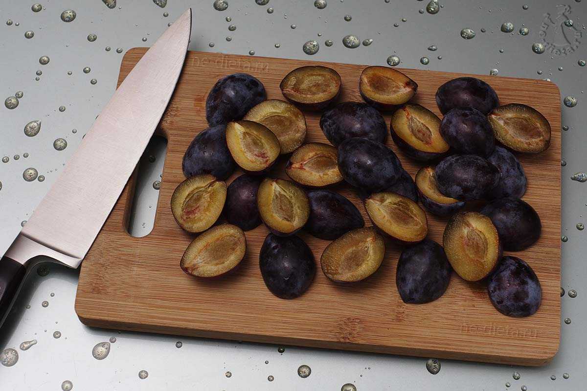 Далее займитесь сливами. Промойте, разрежьте вдоль пополам, извлеките косточку.