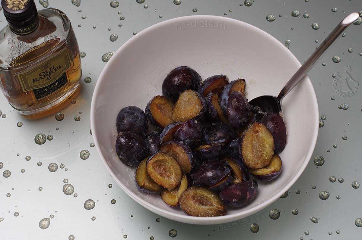 8. Сливы сложить в миску, добавить к ним сахар и по желанию коньяк или ликер на свой вкус и все аккуратно перемешать. Дать начинке постоять при комнатной температуре в течение 10 – 15 минут, чтобы сливы дали сок.