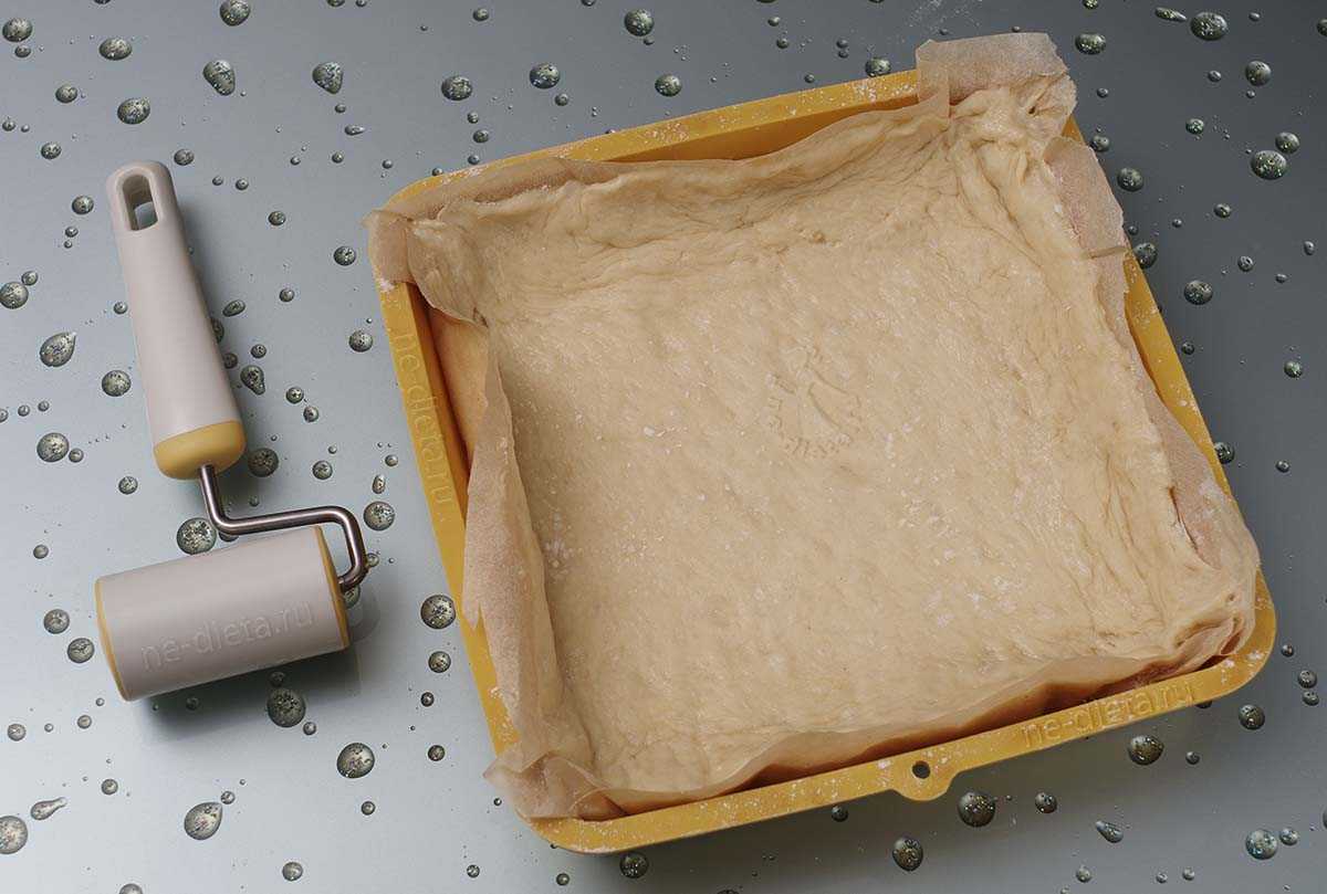 9. Подошедшее тесто обмять, выложить на обильно присыпанную мукой поверхность и разделить на две неравные части. Большую часть теста (примерно 2/3) раскатать на листе пергамента и вместе с бумагой перенести в форму для выпекания, сделав небольшие бортики.