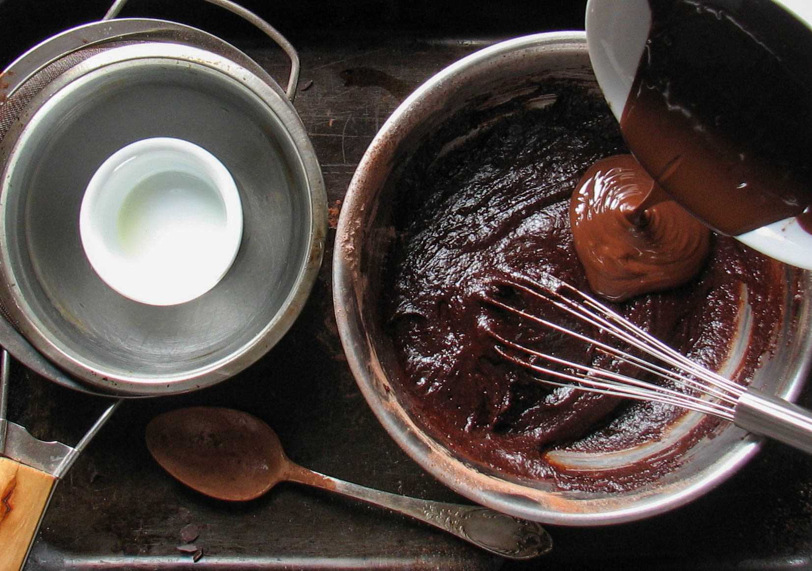 Осторожно добавьте их к получившейся шоколадной смеси. Соедините муку, какао и соду, насыпьте в посуду с расплавленным шоколадом