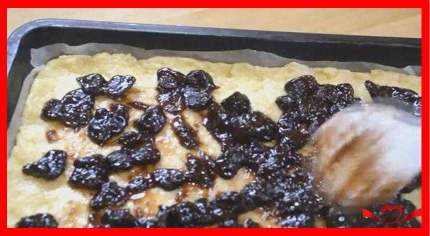 - Плотно укладываем слой теста руками, равномерно покрываем его вареньем.