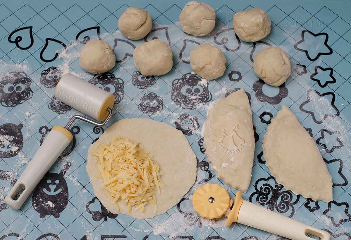 6. Каждый кусочек теста нужно сначала скатать в шарик, а затем скалкой тонко раскатать в форме круга. На одну половину теста положить щедрую порцию тертого сыра, закрыть начинку второй половиной теста и тщательно защипнуть края. Для красоты край пирожка можно обрезать специальным фигурным ножом для теста, чтобы получилась аккуратная волнистая линия.