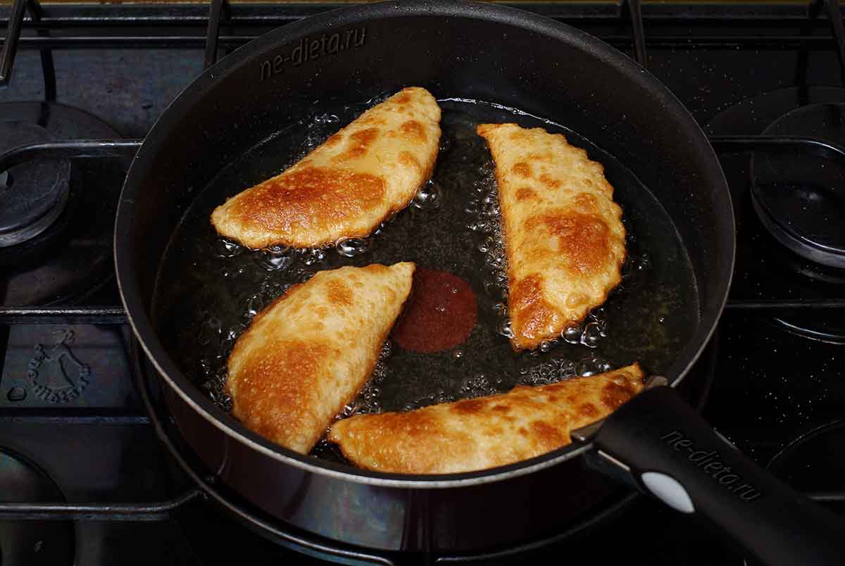 7. В широкой кастрюле или сотейнике необходимо очень хорошо разогреть растительное масло для фритюра, причем толщина слоя масла должна быть примерно 1 – 2 см, чтобы пирожки свободно плавали в нем. В раскаленное масло выложить 3 – 4 пирожка и обжарить их среднем огне до румяной корочки буквально по минуте с каждой стороны.