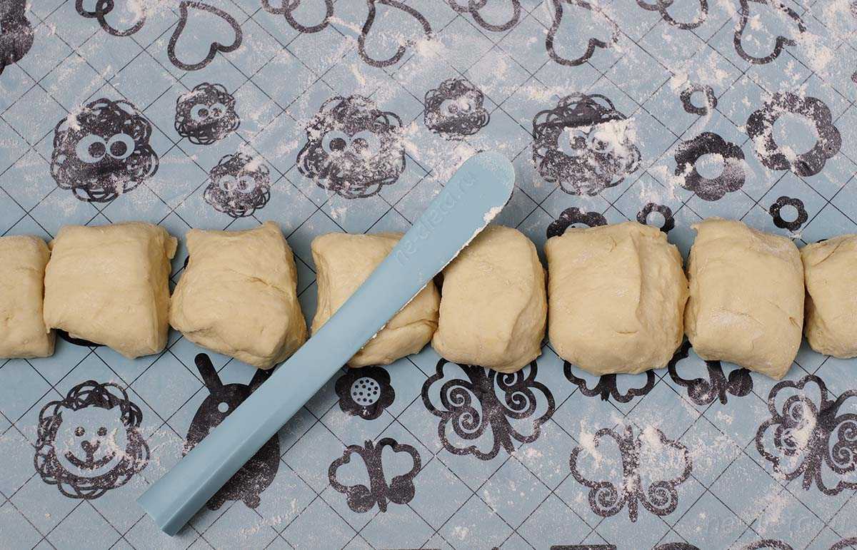5. Тесто выложить на стол или специальный силиконовый коврик, сперва обильно подпылив его мукой, скатать в колбаску и разрезать на 10 частей.