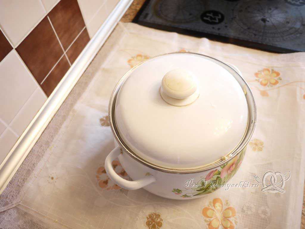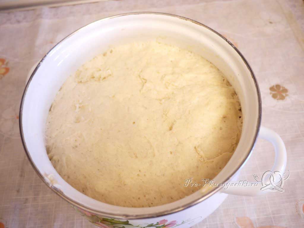 Накрываем кастрюлю крышкой, полотенцем или пищевой пленкой, убираем ее в теплое место на 30-35 мин, когда ее содержимое увеличится в два раза, тесто нужно слегка обмять. Таким образом, мы освобождаем его от накопившихся газов и обогащаем кислородом. Оставляем массу еще минут на 15-20 подниматься в теплом месте. Тесто готово, если сделанное в нем углубление не исчезает, если же оно выравнивается, тесто еще не подошло.