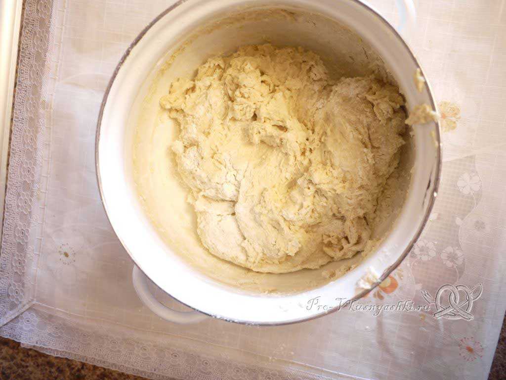 Тщательно вымешиваем тесто, пока оно не начнет отставать от рук и стенок емкости (если оно осталось липким, добавьте немного муки).