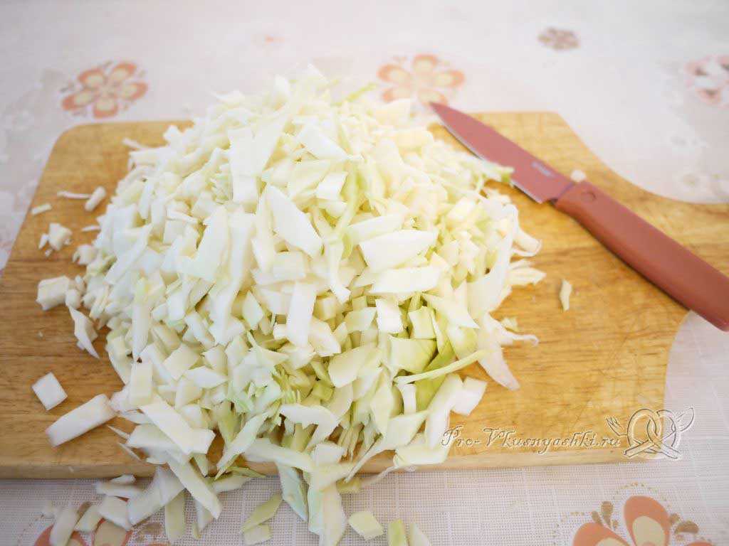 Пока тесто поднимается, займемся начинкой. Капусту необходимо мелко нашинковать.
