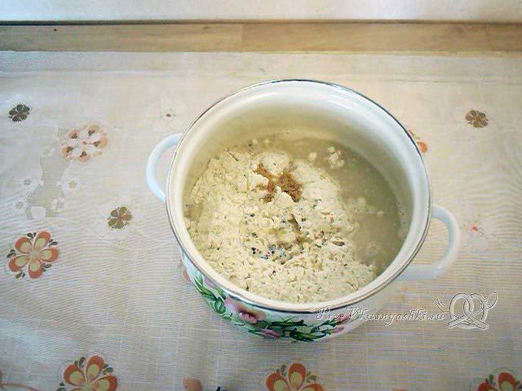 - Муку с солью соедините, потом положите сахар и дрожжи.