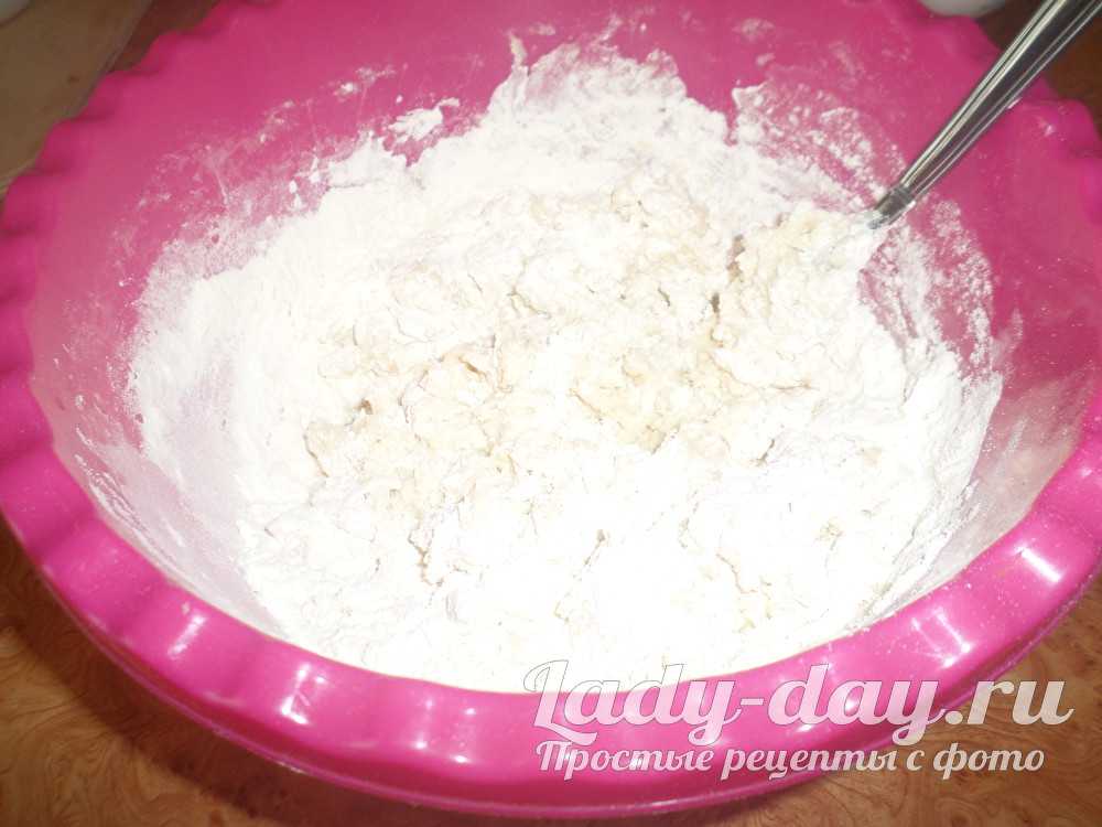 - Тщательно перемешать массу большой ложкой и понемногу добавляя просеянную муку, смешанную с ванилью, замесить пластичный комок теста.