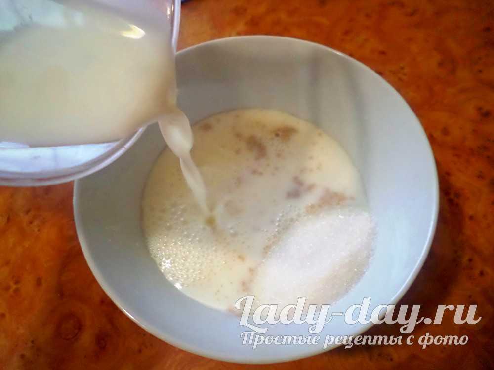 - Для начала подогреть до температуры тела молоко и растворить в нем дрожжи, дать им начать расти: масса начнет пениться и увеличиваться. Через десять минут влить в нее теплую воду, добавить сахар и слегка взбитое с маслом яичко.