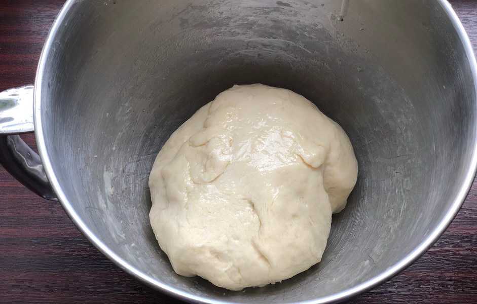 Начинаем частями добавлять просеянную муку и замешиваем наше тесто. Я пользовалась насадной «крюк» планетарного миксера, тоже самое можно делать руками. Тесто необходимо хорошо вымесить: оно должно быть мягким, но не липнуть к рукам. На замешивание теста у меня ушло около 10-15 минут.