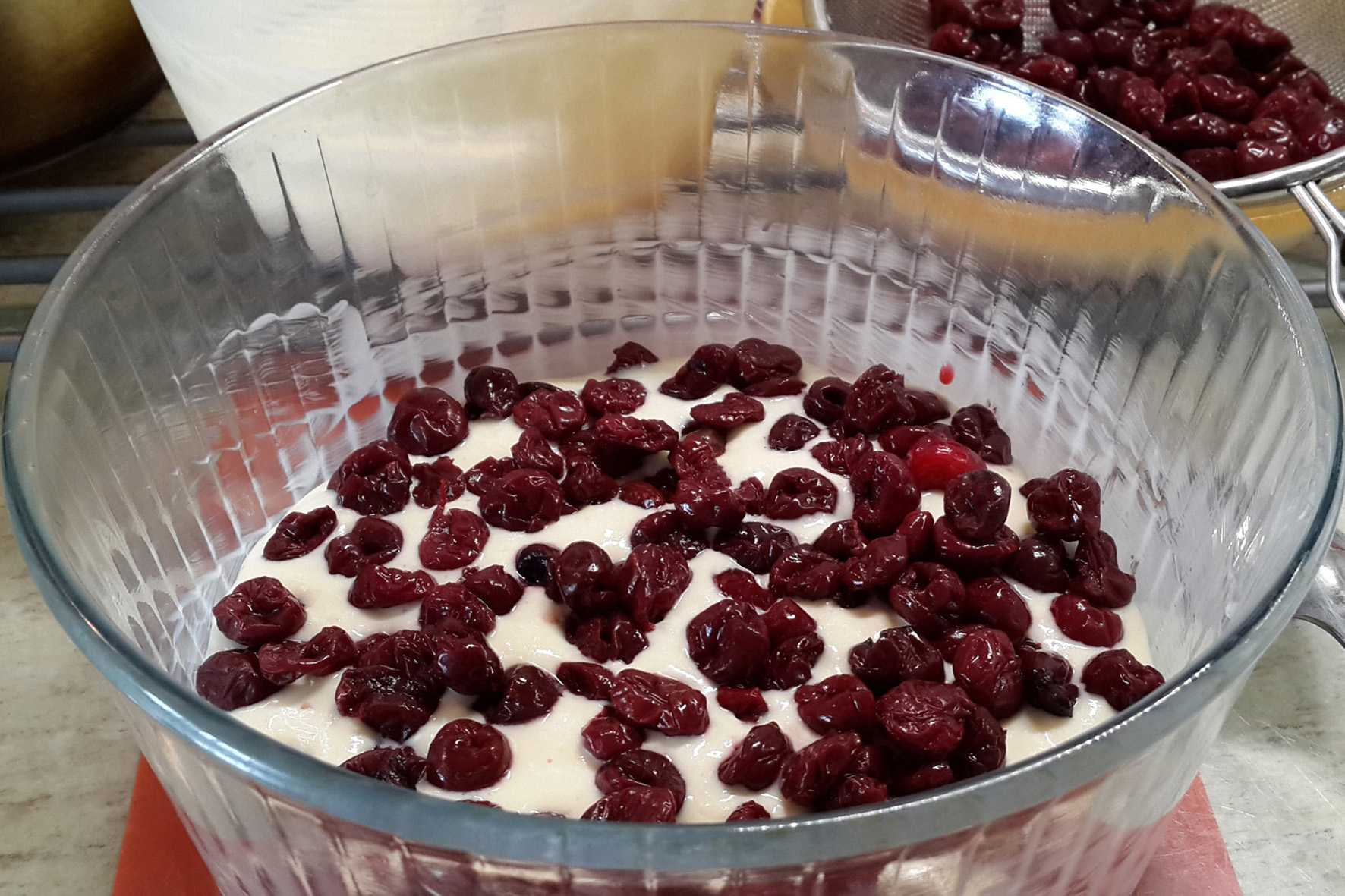 При приготовлении пирога с какао начинку делают заранее. При этом вишню очищают, заливают алкоголем и оставляют в условиях комнатной температуры на 12 часов. По прошествии указанного времени приступают непосредственно к приготовлению десерта: