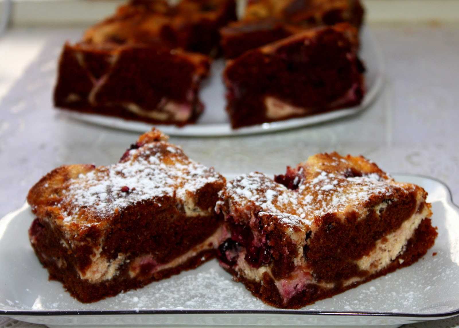 Шоколадный пирог с вишней в оригинальной подаче содержит в своем составе творог. В нем гармонично сочетаются несложные ингредиенты. Десерт – брауни с вишнями состоит из трех слоев. Он представляет собой пирог с творожной прослойкой и ягодной начинкой.