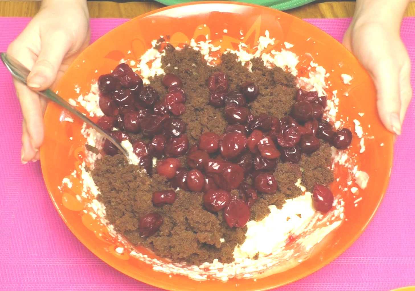- Корж требуется разрезать на две части, одна из которых тоньше. Из толстой половинки извлекается середина, измельчается, смешивается с вишней и частью крема, помещается в холодильник. Коржи необходимо пропитать остатками ягодной жидкости.