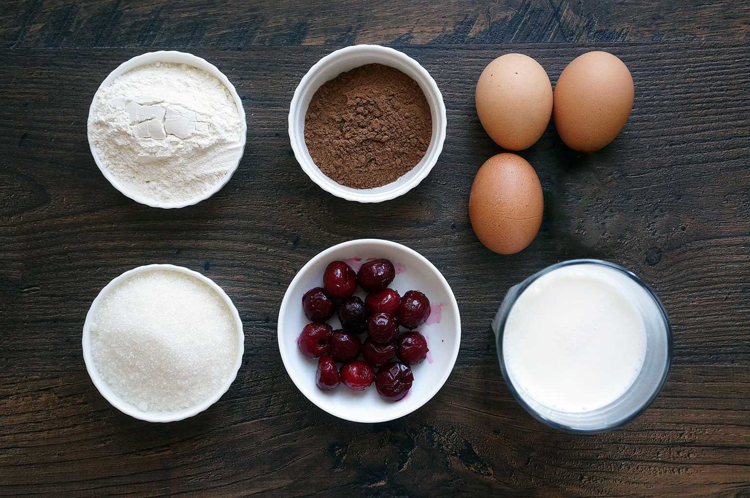 Существует множество рецептов приготовления шоколадно-вишневого пирога. В десерт можно добавлять коньяк или ликер. Выпечку готовят как на кефире, так и на молоке. Необходимые ингредиенты перечислены в таблице.