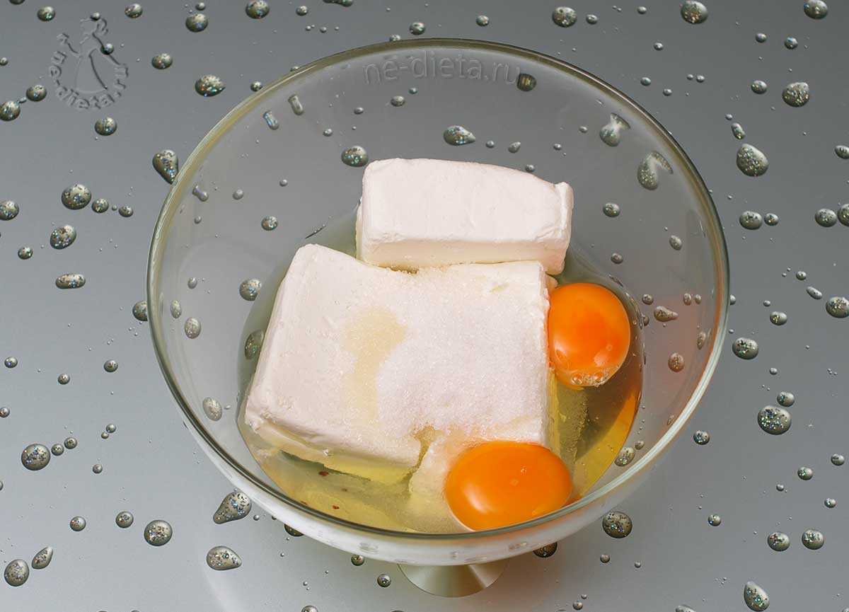 Яйца вбейте в отдельную миску, добавьте сахар и взбивайте миксером до образования пены. Яичную смесь перелейте в творожную массу. Всыпьте просеянную муку с пекарским порошком. Продолжайте взбивать. Должна получиться масса, консистенции густой сметаны.