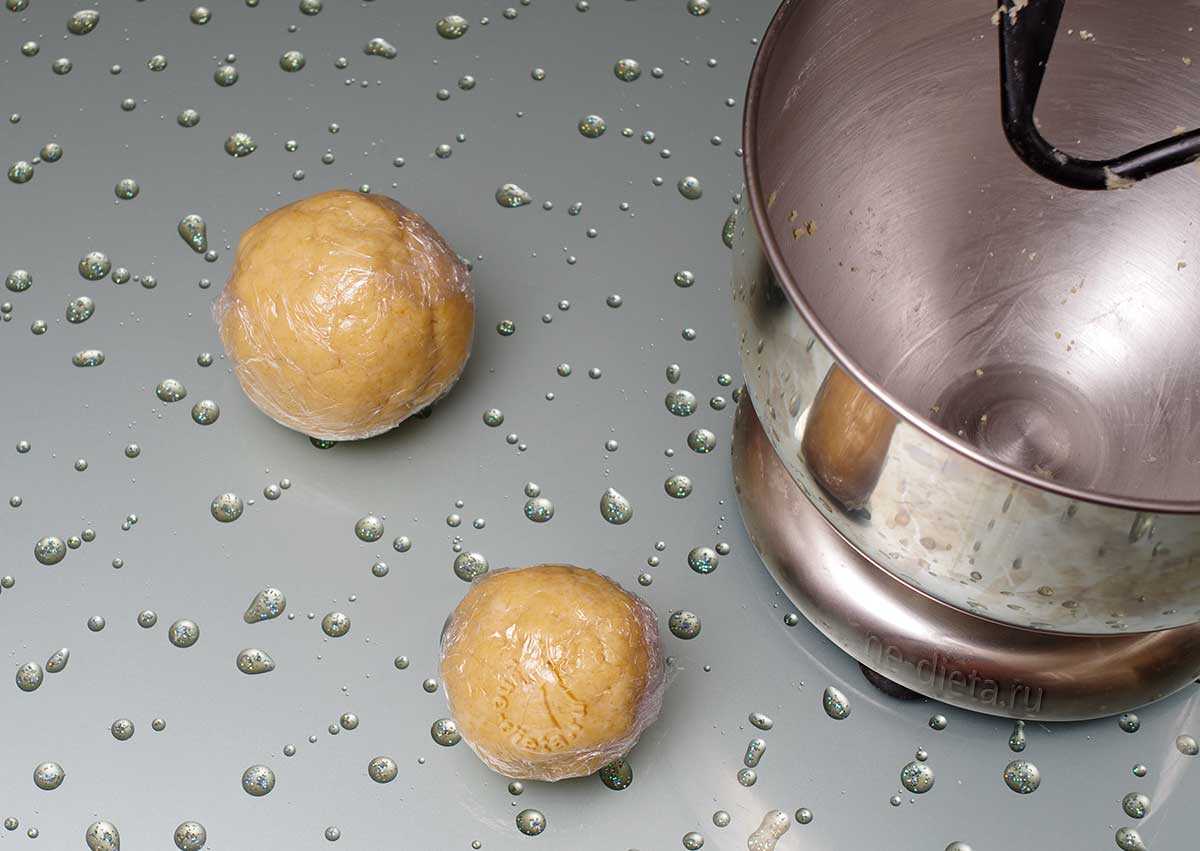 5. Получившееся эластичное тесто надо разделить на две неравные части – побольше для основы и поменьше для верха, скатать из них шарики, завернуть в пищевую пленку и положить в морозилку на 30 минут.