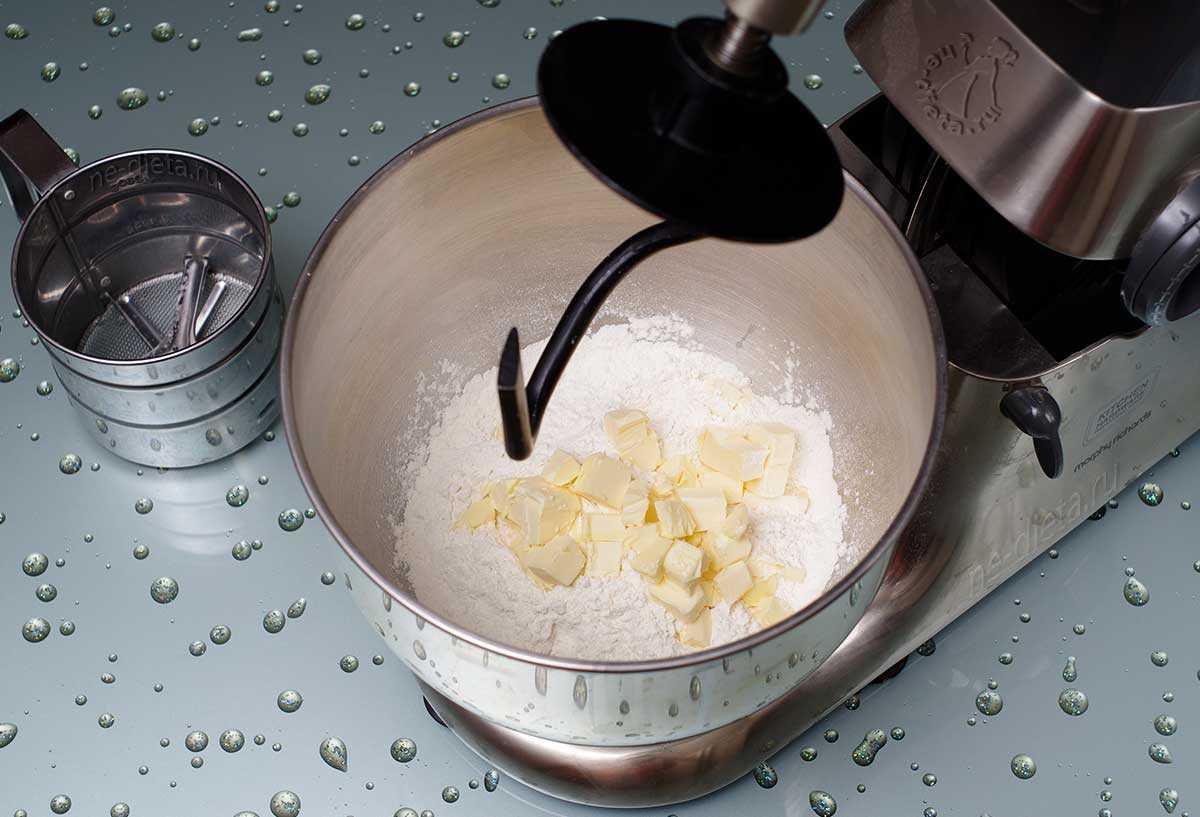 350 грамм муки просеять с 10 грамм разрыхлителя и 0,5 граммами соли, выложить в чашу кухонного комбайна (насадка металлический нож). Добавить нарезанное кусочками холодное сливочное масло (125 г). Измельчить до образования крошки (1 минута работы комбайна).