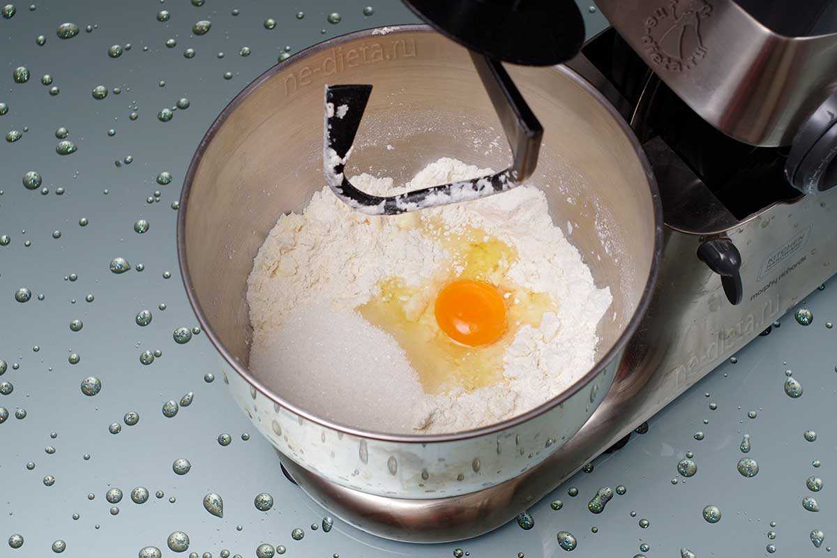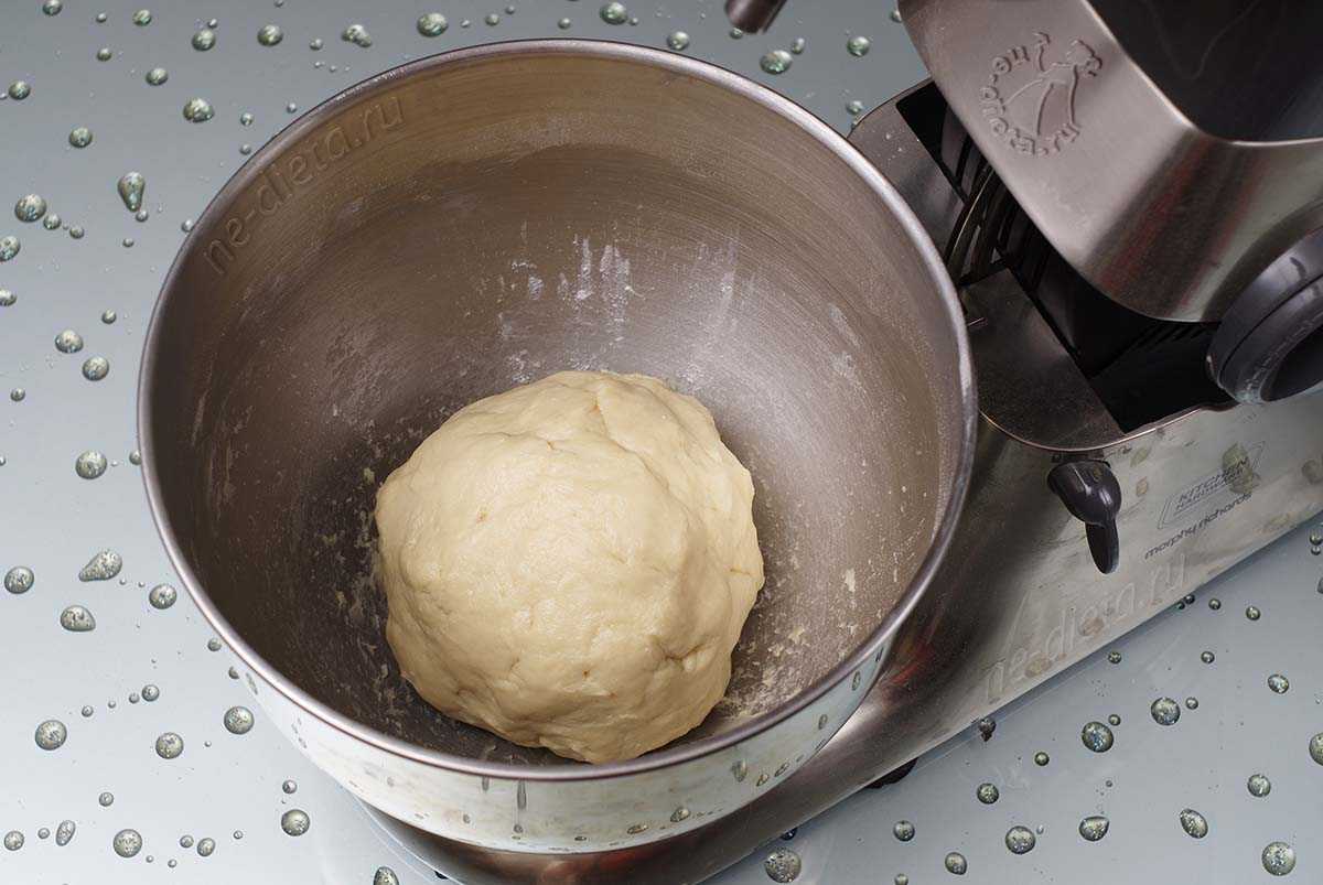 4. Замесить тесто руками или в комбайне с помощью насадки «крюк». Затем необходимо добавлять в тесто воду по одной столовой ложке, тщательно перемешивая, пока оно не начнет собираться в плотный комок.