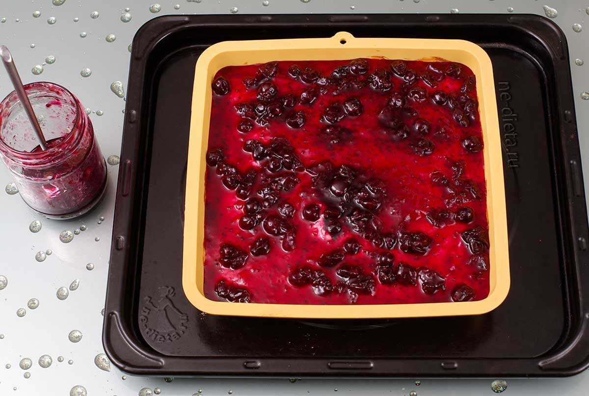 10. Затем форму вынуть из духовки и равномерно распределить поверх творога варенье или джем.