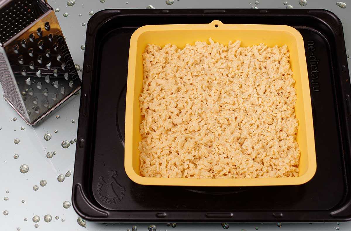 8. Большую часть теста достать из морозилки и натереть на крупной терке прямо в форму, равномерно распределив стружку теста по дну.