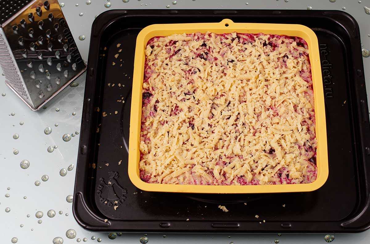 Сверху – оставшееся тесто трем на крупной терке или крошим руками.