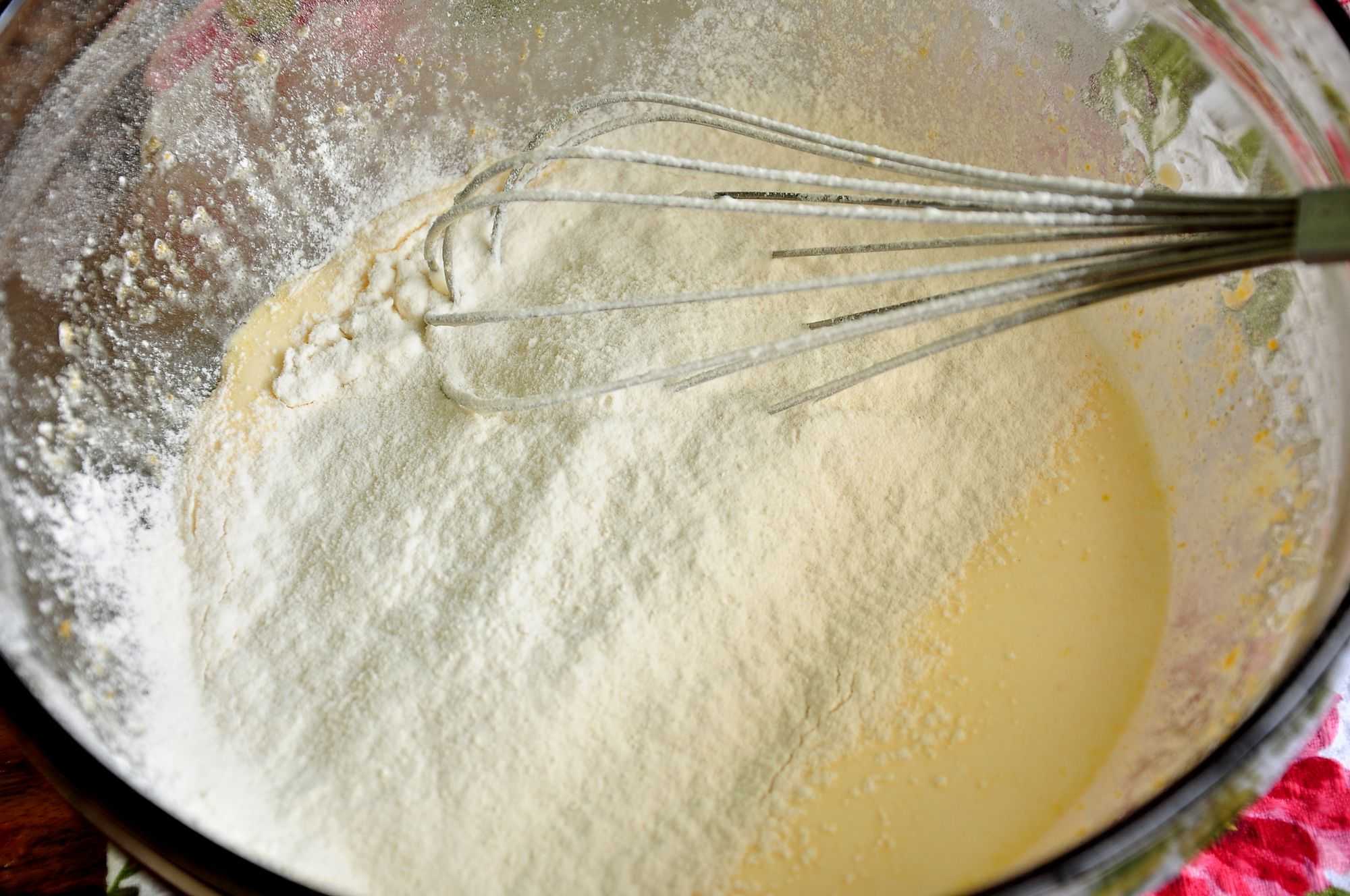 Добавляем к ней просеянную пшеничную муку, смешанную с разрыхлителем.