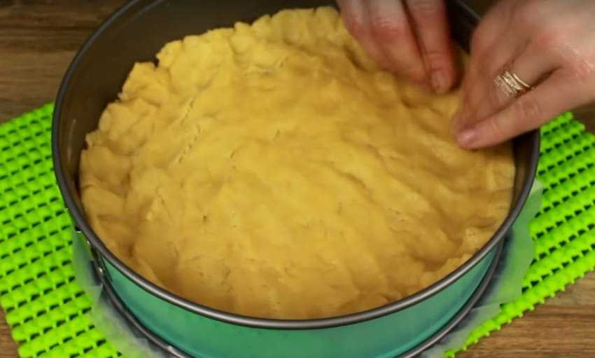 7. Достаньте тесто из холодильника и распределите его руками в разъёмной или силиконовой форме для выпечки. Тесто равномерно растяните по дну и сделайте бортики высотой 2,5-3 сантиметра. Если у вас разъемная форма, дно застелите пергаментом, промазанным сливочным маслом.