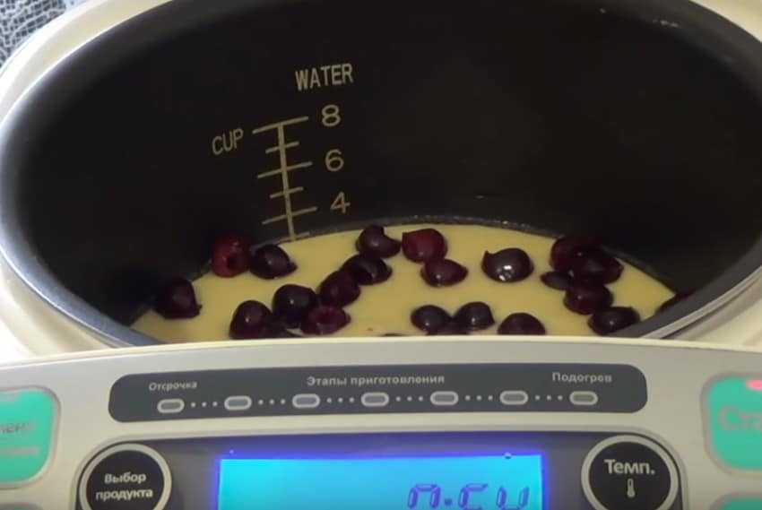 5. Через 5-7 минут откройте крышку мультиварки и распределите в тесте вишню. Поставьте еще на 50 минут. Если у вас мало времени на приготовление, заранее смешайте ягоды с тестом.