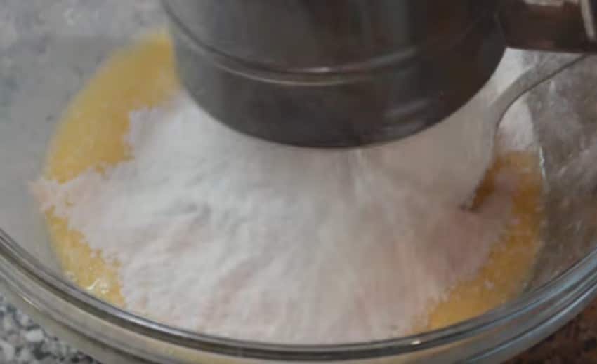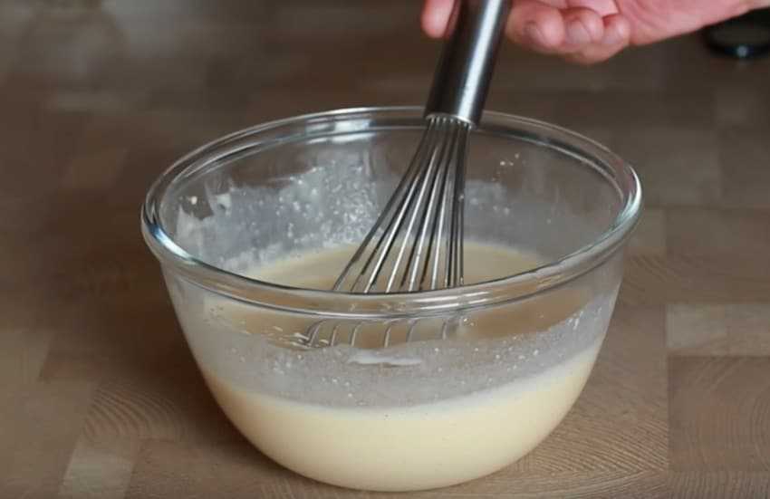 3. Постепенно подмешивайте муку, взбивая до однородной массы без комочков.