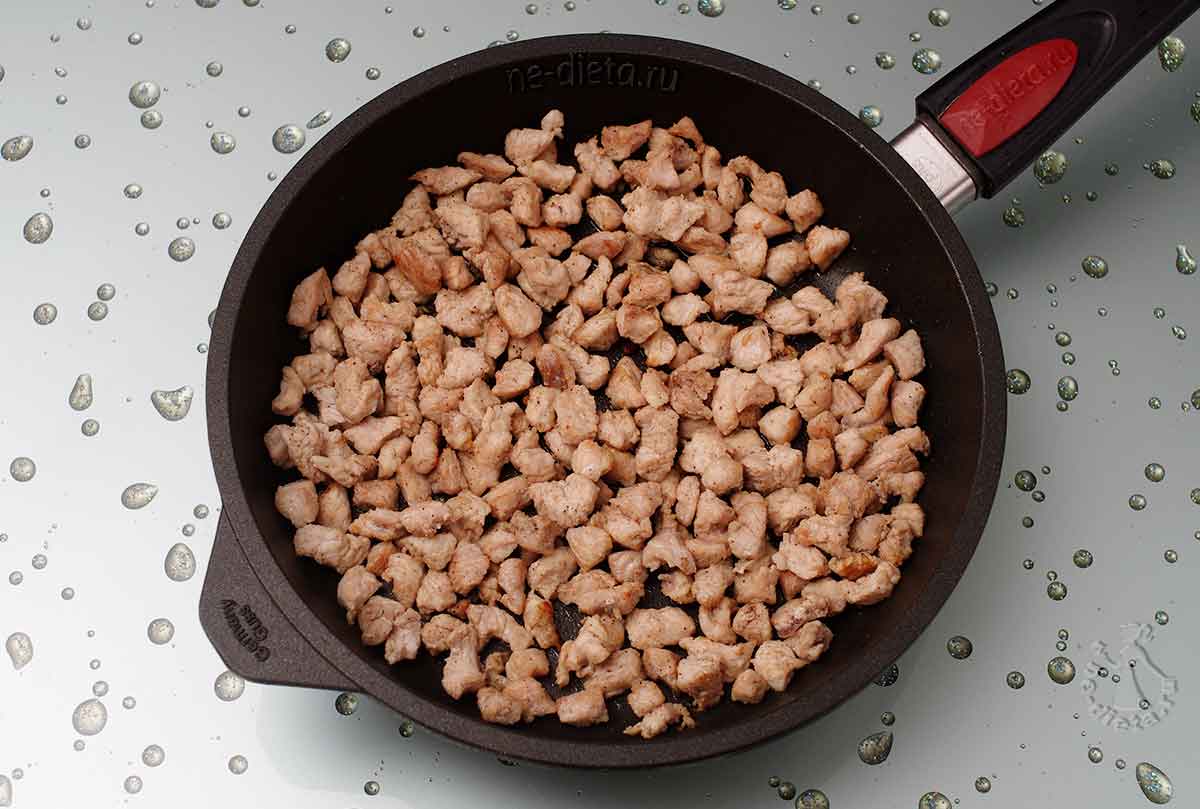5. В сковороде хорошо разогреть 3 – 4 ст. л. растительного масла, положить мясо и готовить его на сильном огне при частом помешивании в течение 5 – 7 минут, пока оно не покроется со всех сторон румяной корочкой. Если в процессе обжаривания выделится влага, то ее нужно сначала полностью выпарить, и только после этого ждать, пока кусочки мяса слегка подрумянятся. В конце приготовления мясо следует посолить и поперчить, снять с плиты и остудить по меньшей мере до теплого состояния.