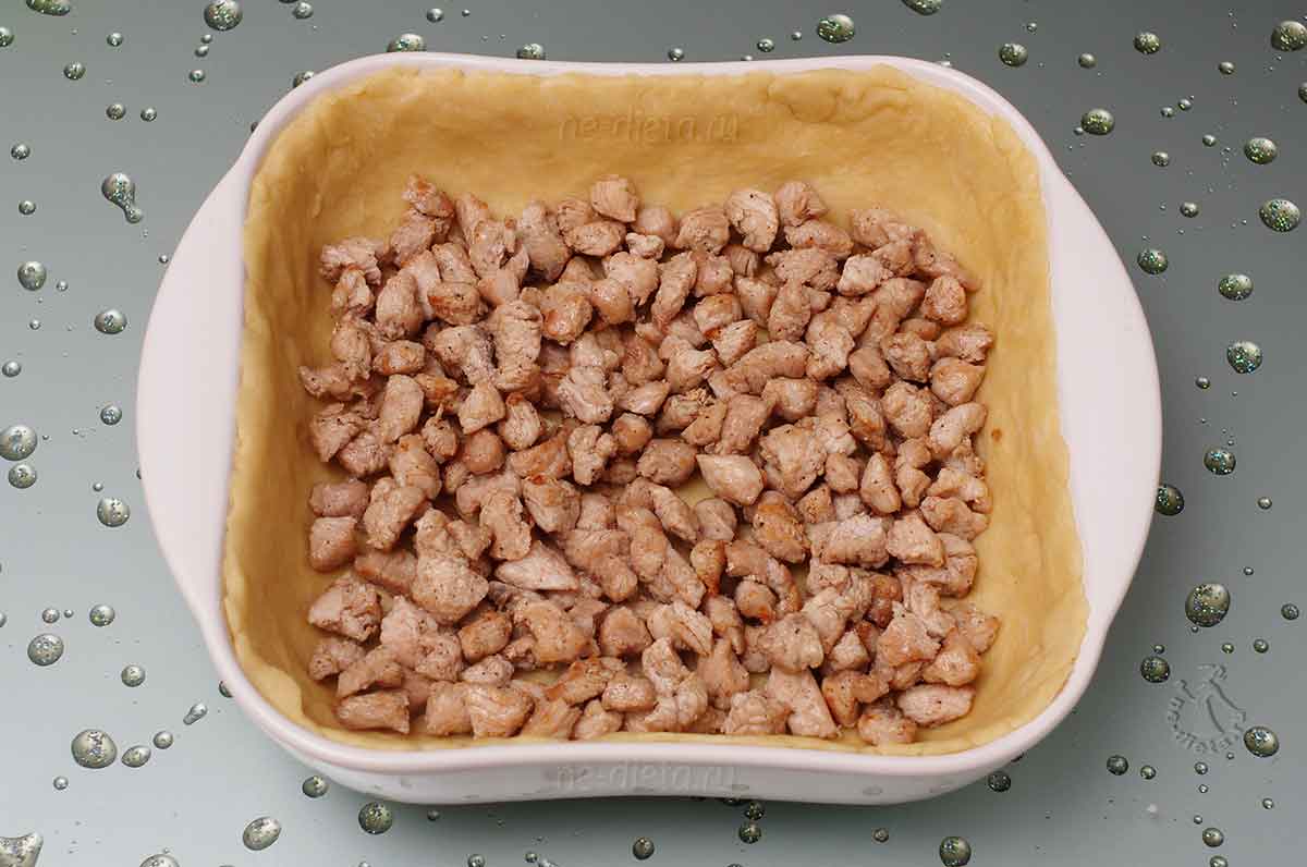 12. На дно ровным слоем выложить жареные кусочки мяса.
