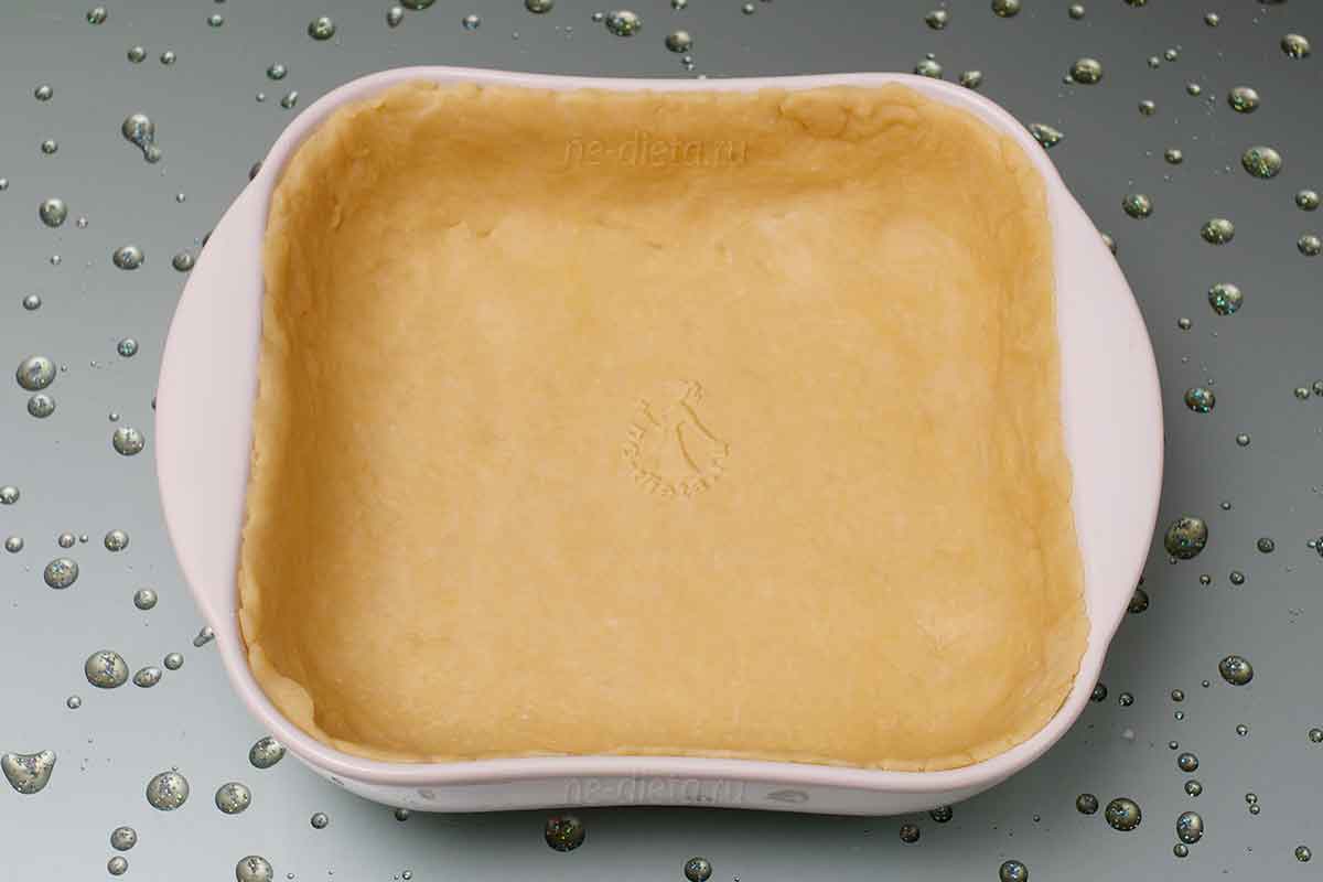 - Замесить тесто с мучной составляющей. Раскатать корж по форме с небольшими бортиками.