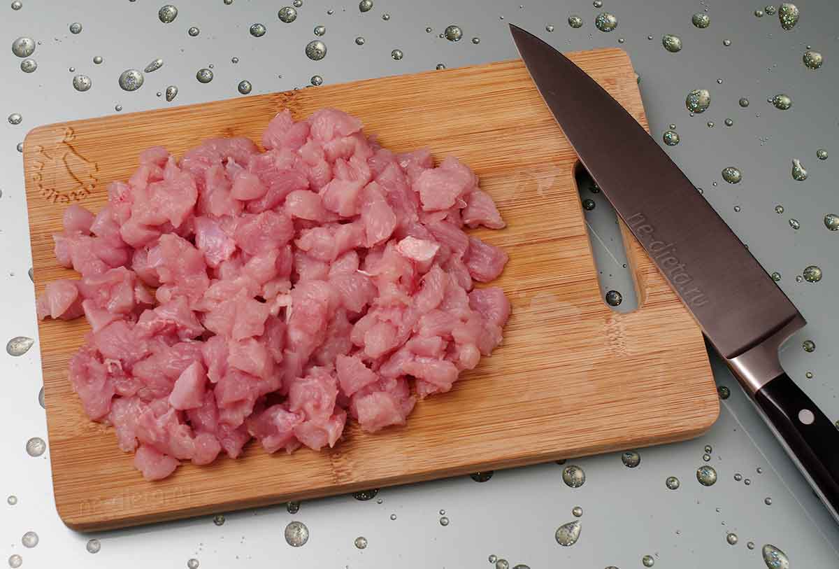 4. Пока тесто охлаждается, можно успеть подготовить все остальные компоненты для пирога. Чтобы сделать начинку, мясо надо вымыть, обсушить и нарезать маленькими кубиками.