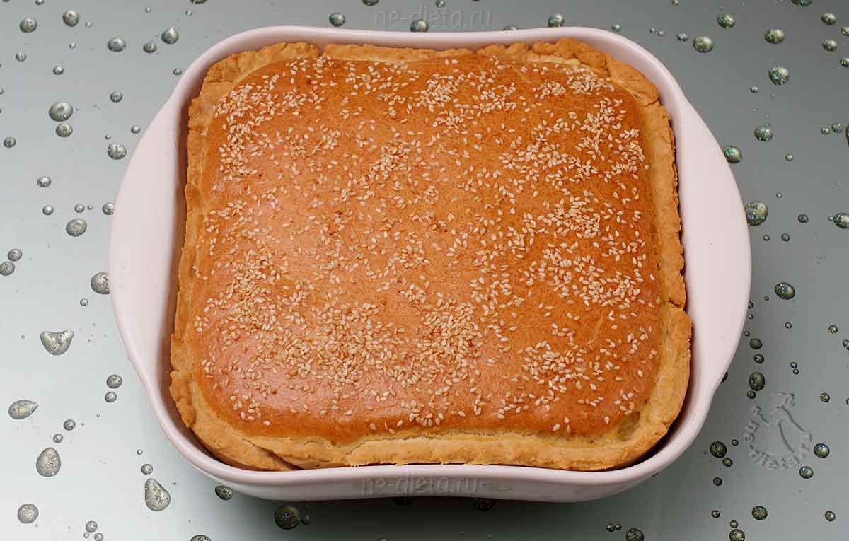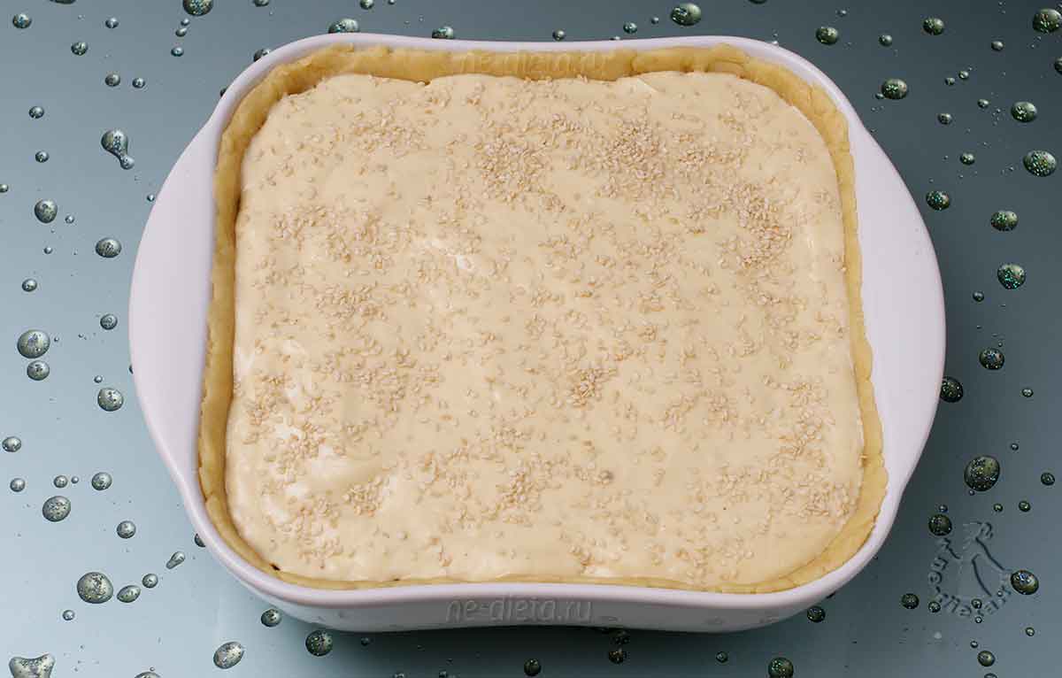 14. Начинку полностью закрыть заливным тестом, поверхность которого разровнять и присыпать кунжутом.