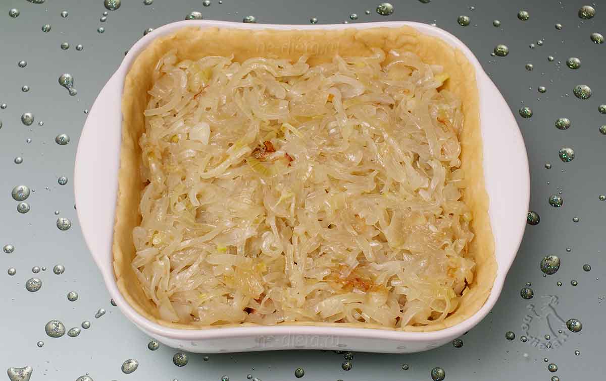 6. Репчатый лук очистить и нарезать тонкими полукольцами. Не стоит волноваться, что лука кладется так много, ведь он довольно гармонично вписывается в этот пирог и совсем не кажется чем-то доминирующим и излишним.