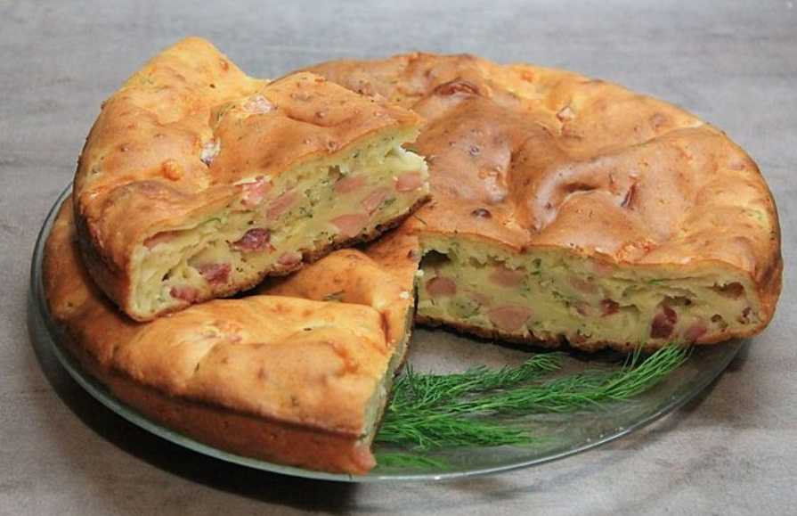 А затем вкуснейший пирог, приготовленный с колбасой и сыром на сковороде, нарезать на части и горячим (или тёплым) подать к столу.